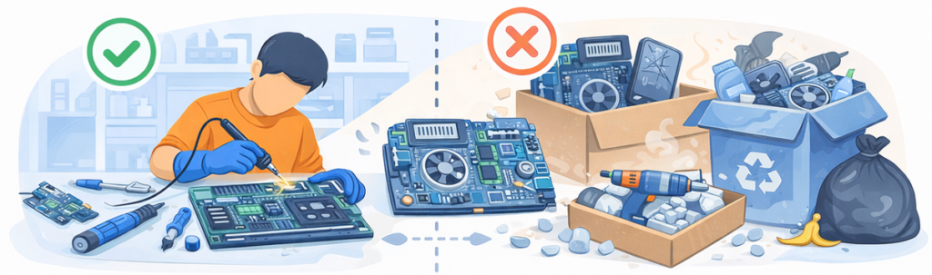 오늘날 많은 제조사는 편의를 이유로 모듈 단위 수리를 권장하고,이는 아직 사용할 수 있는 부품까지 폐기하게 만드는 자원 낭비로 이어집니다.